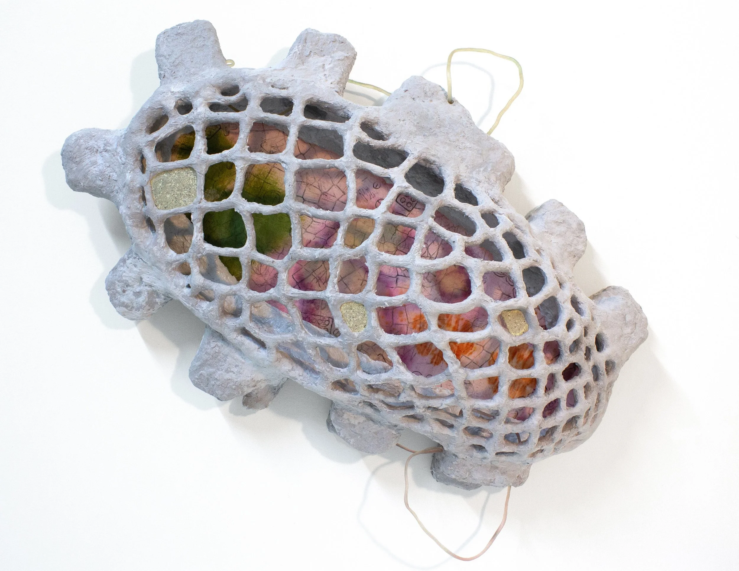 Untitled (Hush, Hush) / Mixed media including repurposed paper, bio-polymer alginate filament, unrefined sand, methylcellulose, linocut block printed, botanically dyed, and UV-printed used pillowcases / 2024